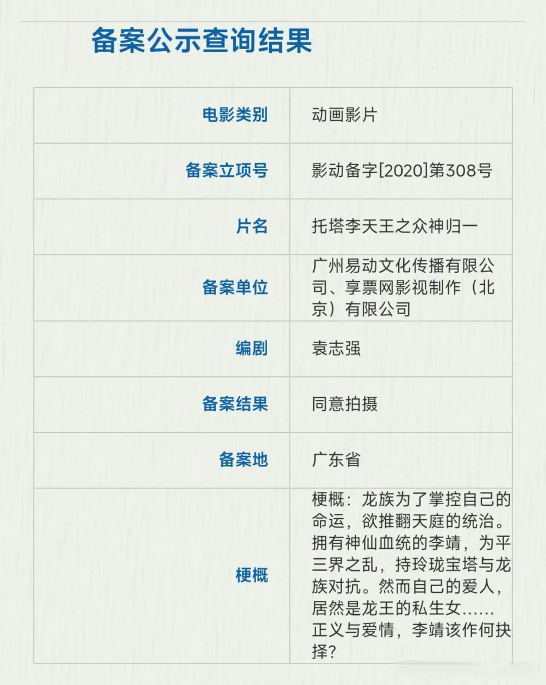 动画电影《托塔李天王之众神归一》此前在2020年11月3日就有过一次备案,