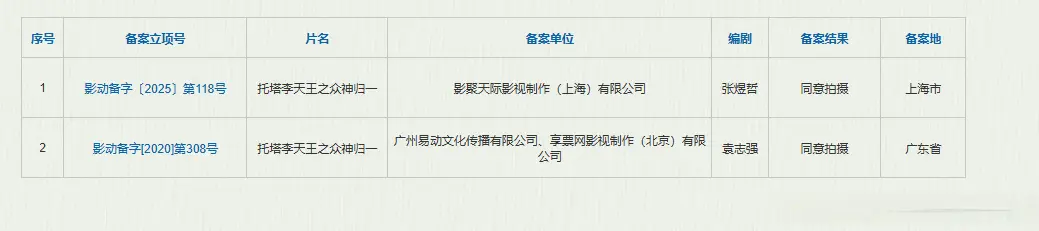 在国家电影局关于2025年10月上全国电影剧本(梗概)备案、立项公示的通知中,动画电影《托塔李天王之众神归一》由影聚天际影视制作(上海)有限公司备案了,张煜哲担任编剧,